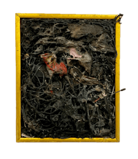 an abstract painting with black, yellow, and green colors