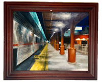 a painting of a train station in a gold frame