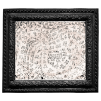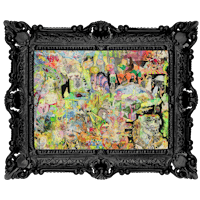 an abstract painting in a gold frame on a black background