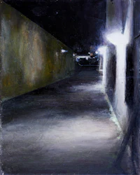 a painting of a city street at night
