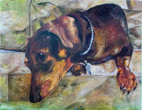 a painting of a brown rabbit sitting on a green background