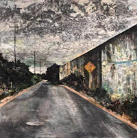 a painting of a road with a sign on it