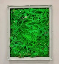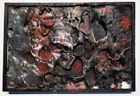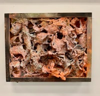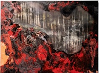 a painting with pink and black paint on a gold frame