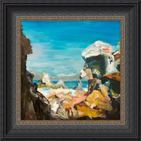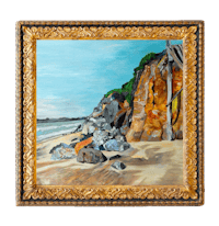 a gold framed painting of a red and green painting