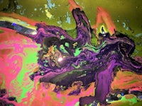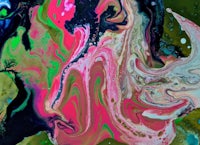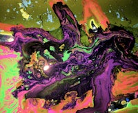 a red, green, and yellow painting on a black background