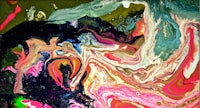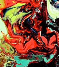 an abstract painting with red and black swirls